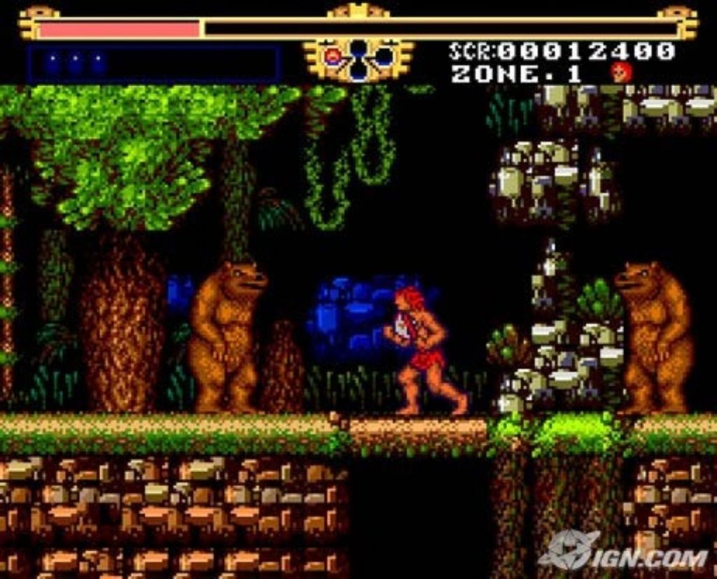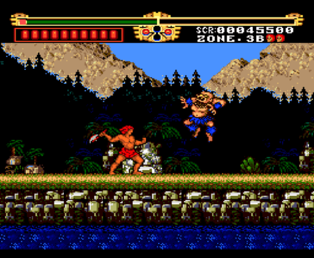 Instead of leading the TurboGrafx-16 launch with an anime hero no one had heard of, NEC could have slammed into the North America market at the height of Barbarian mania with a protagonist that looked like he was ripped straight out of the Conan films. His name was Gogan, wearing a simple fur loincloth and wielding a massive weapon that wrought destruction upon his enemies. The character design leveraged the hardware’s ability to render large multi-colored sprites which gave Gogan a muscular definition and weight that 8-bit characters lacked. This physicality was central to the experience as the character performance is defined not by acrobatic finesse but by raw power and endurance.